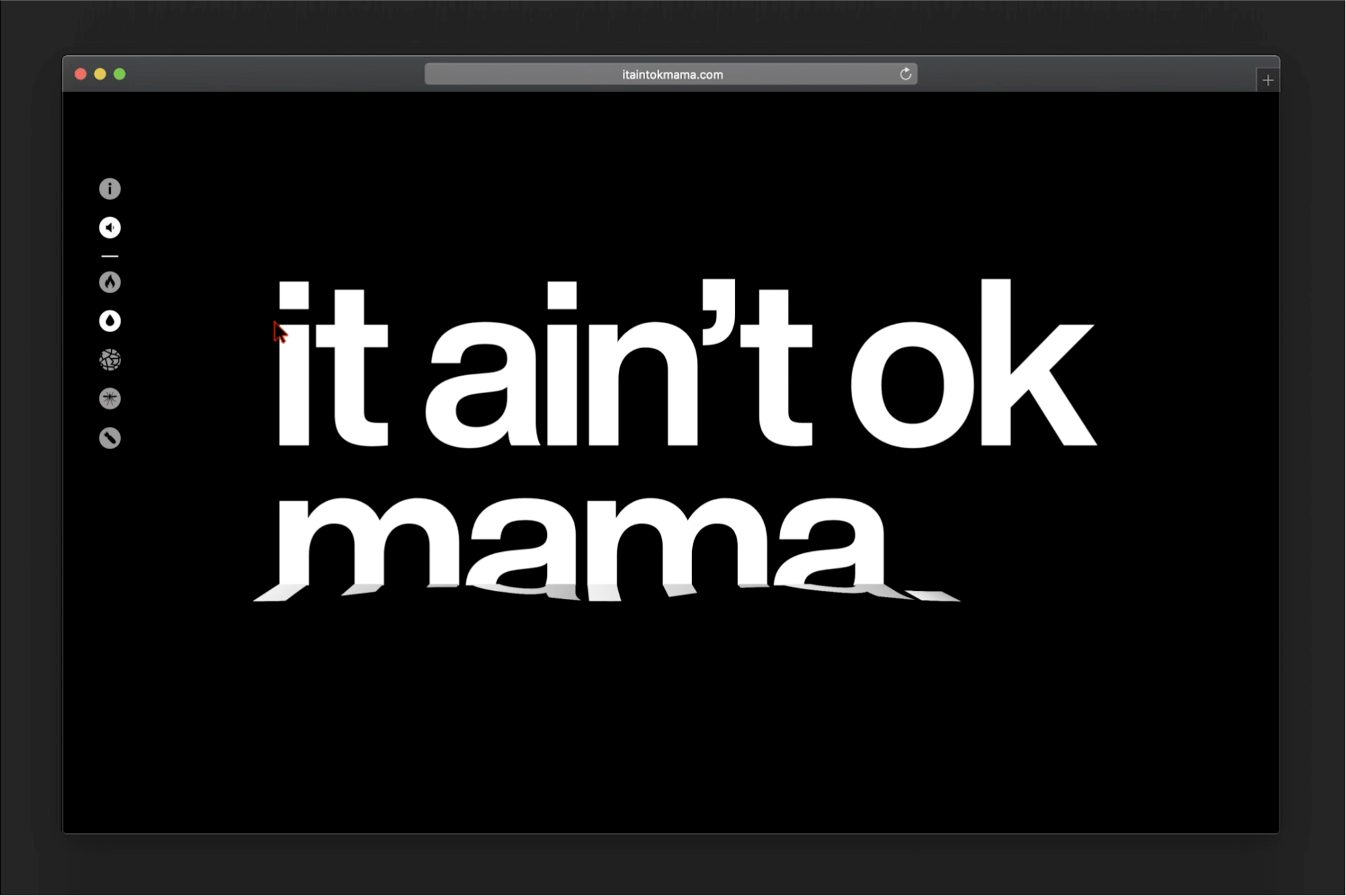 Mama is an interactive music video for a song off Johnny Selman’s Rockaway EP. A lyrical observation of the wild abuses our planet and people have suffered, the video allows users to “heal” the typographic manifestations of fire, drought, floods, disease, and war on the lyrical refrain “it ain’t okay mama.” Check out the mama site, or find Mama and the rest of the Rockaway EP on Spotify and Apple Music.