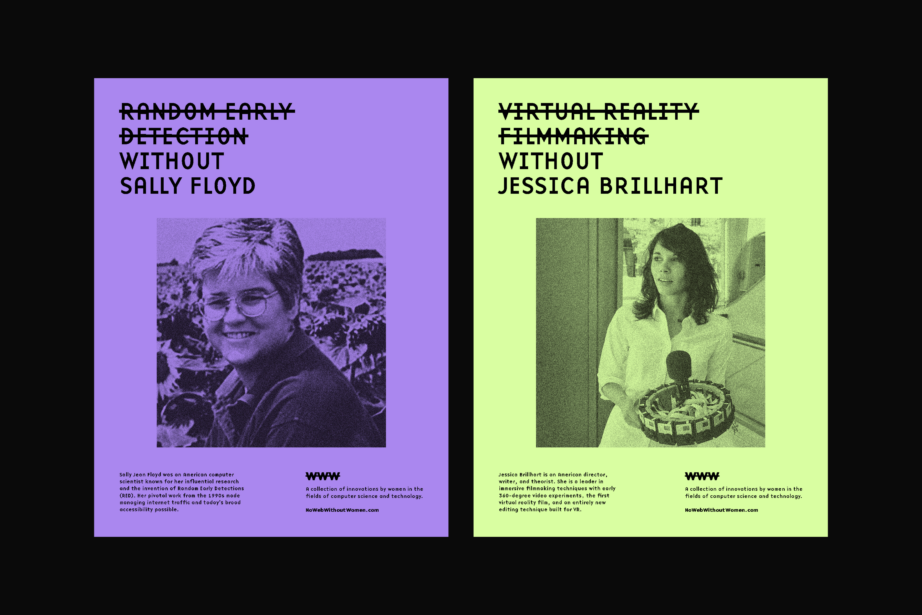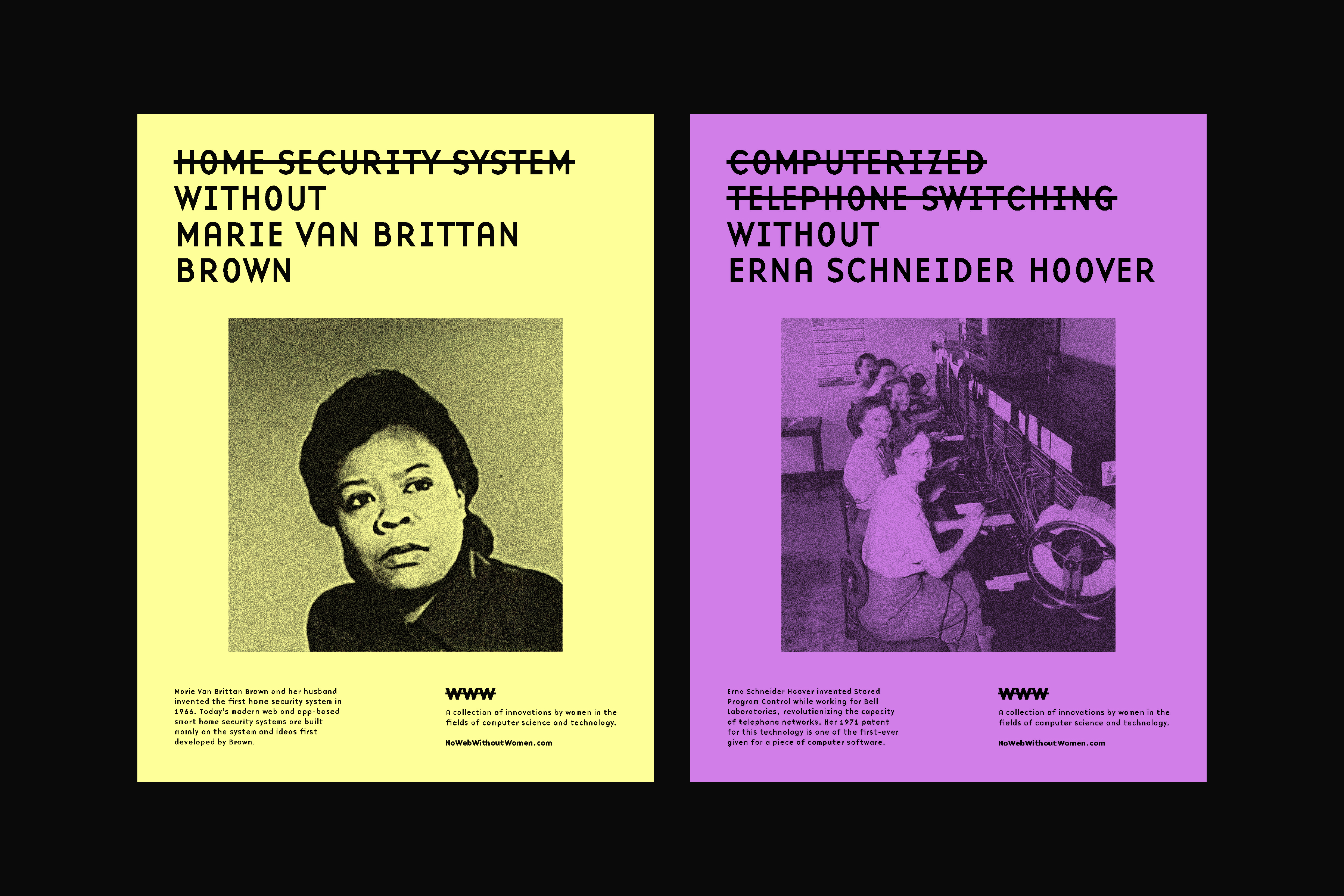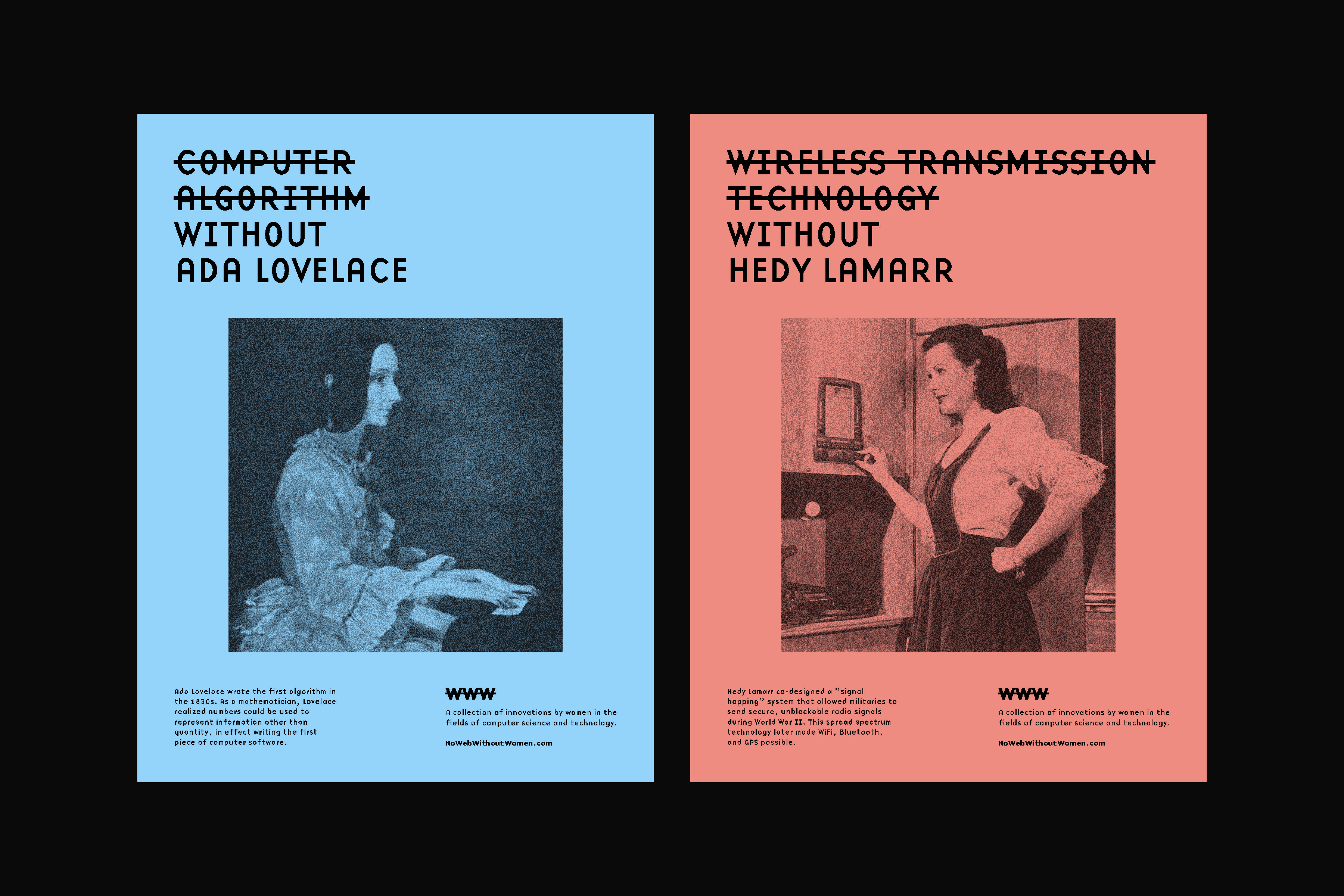 This self-initiated project was conceived in honor of Women’s History month not only to further the essential dialogue around gender equality, but also to serve as a testament to the resilience of these women, and the extent to which our contemporary lives now revolve around behavior their pioneering works make possible. A messaging epiphany emerged as we realized there is simply No Web Without Women.