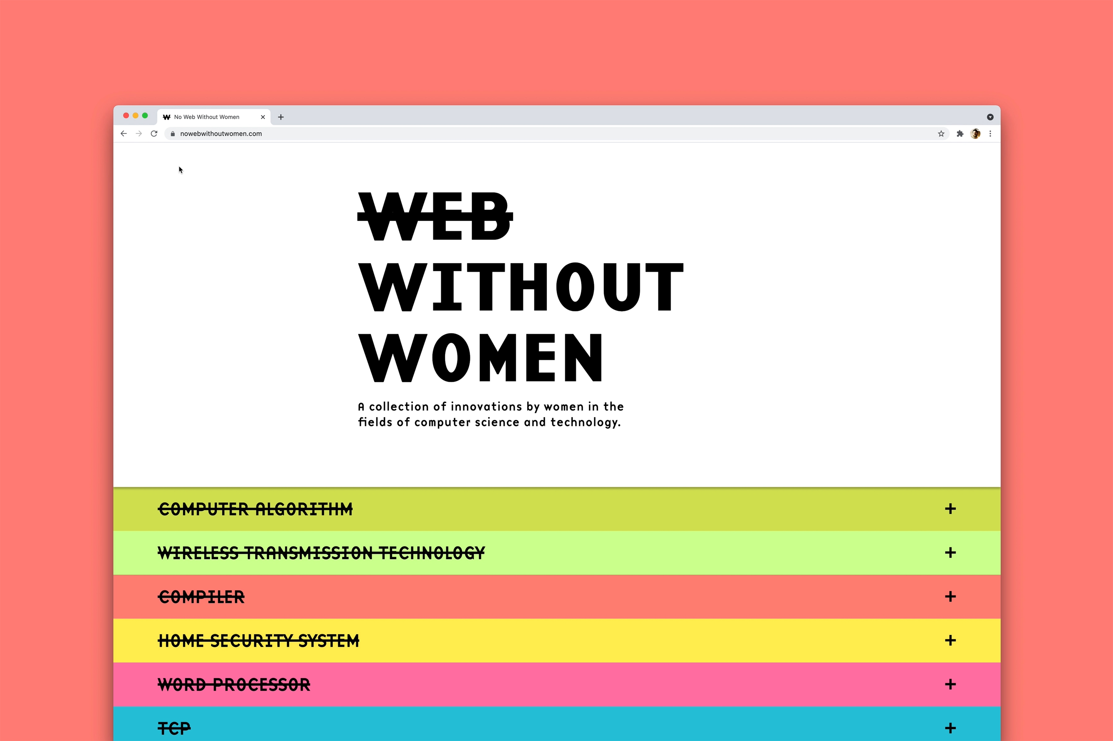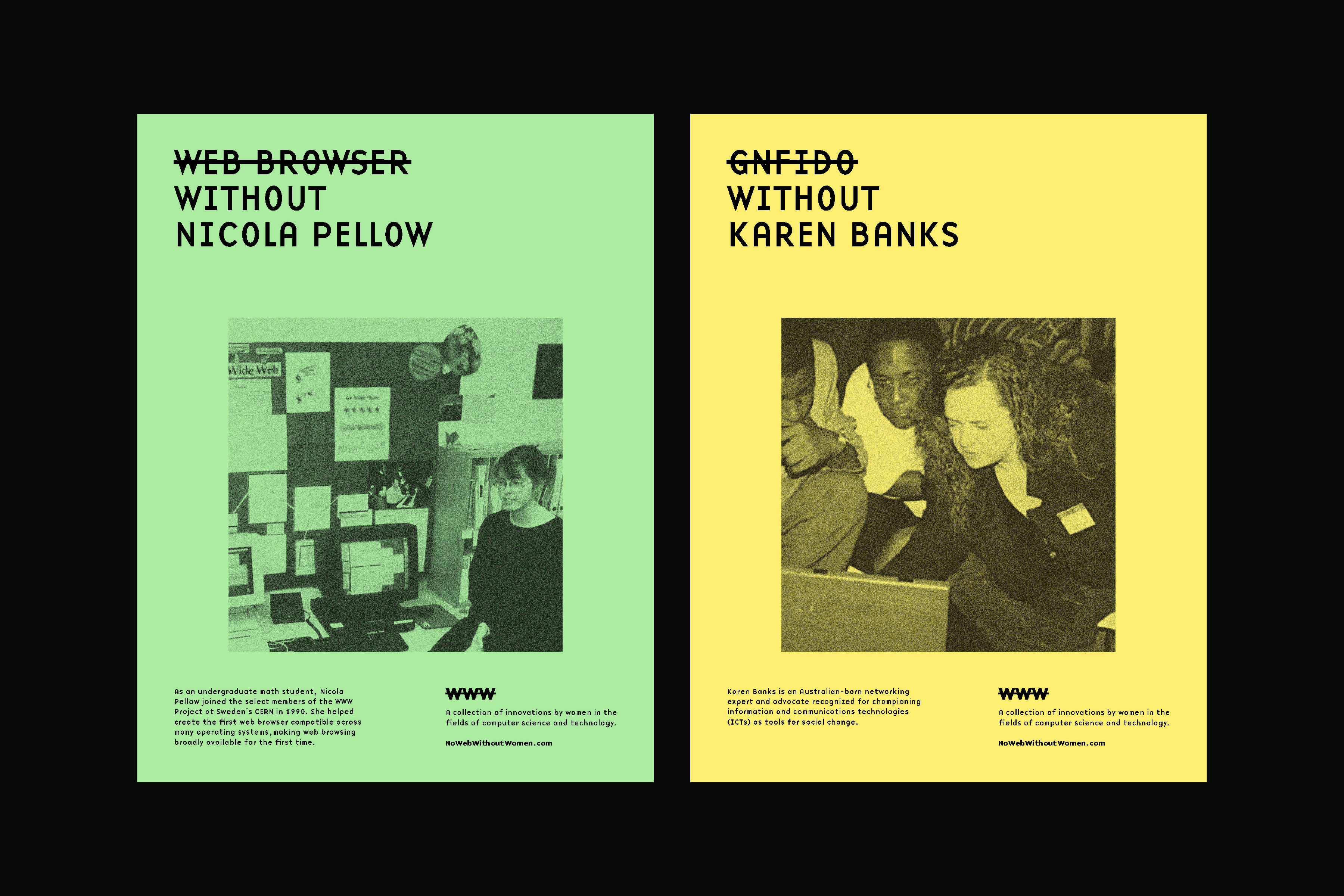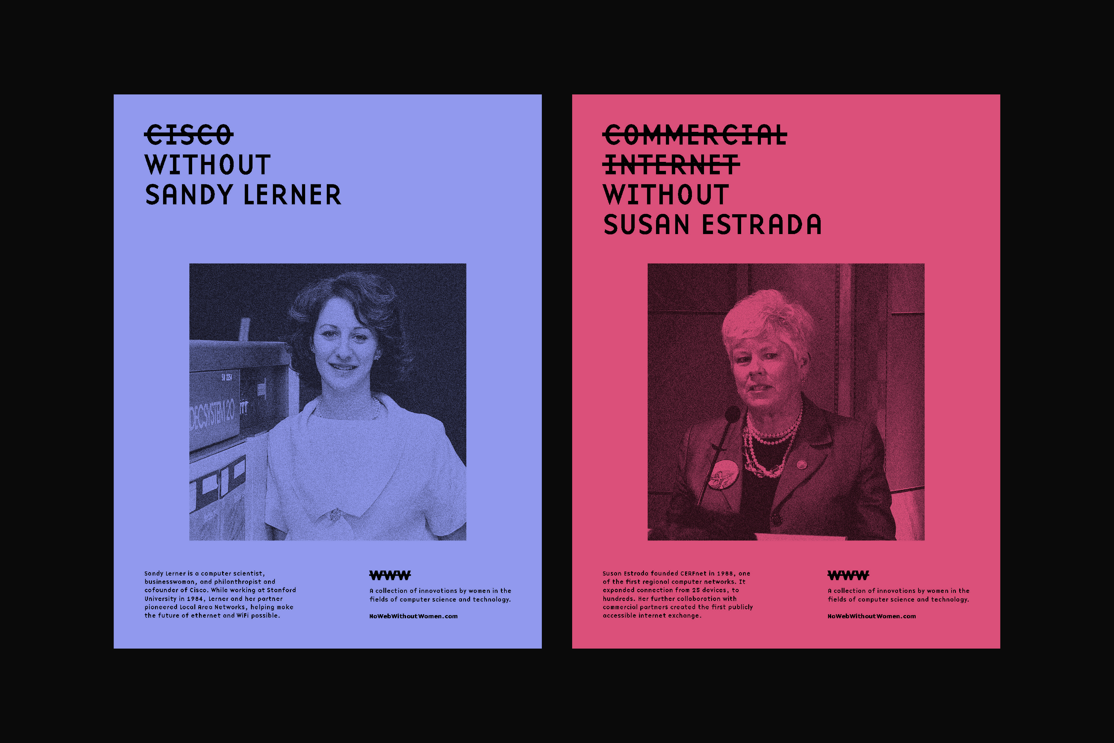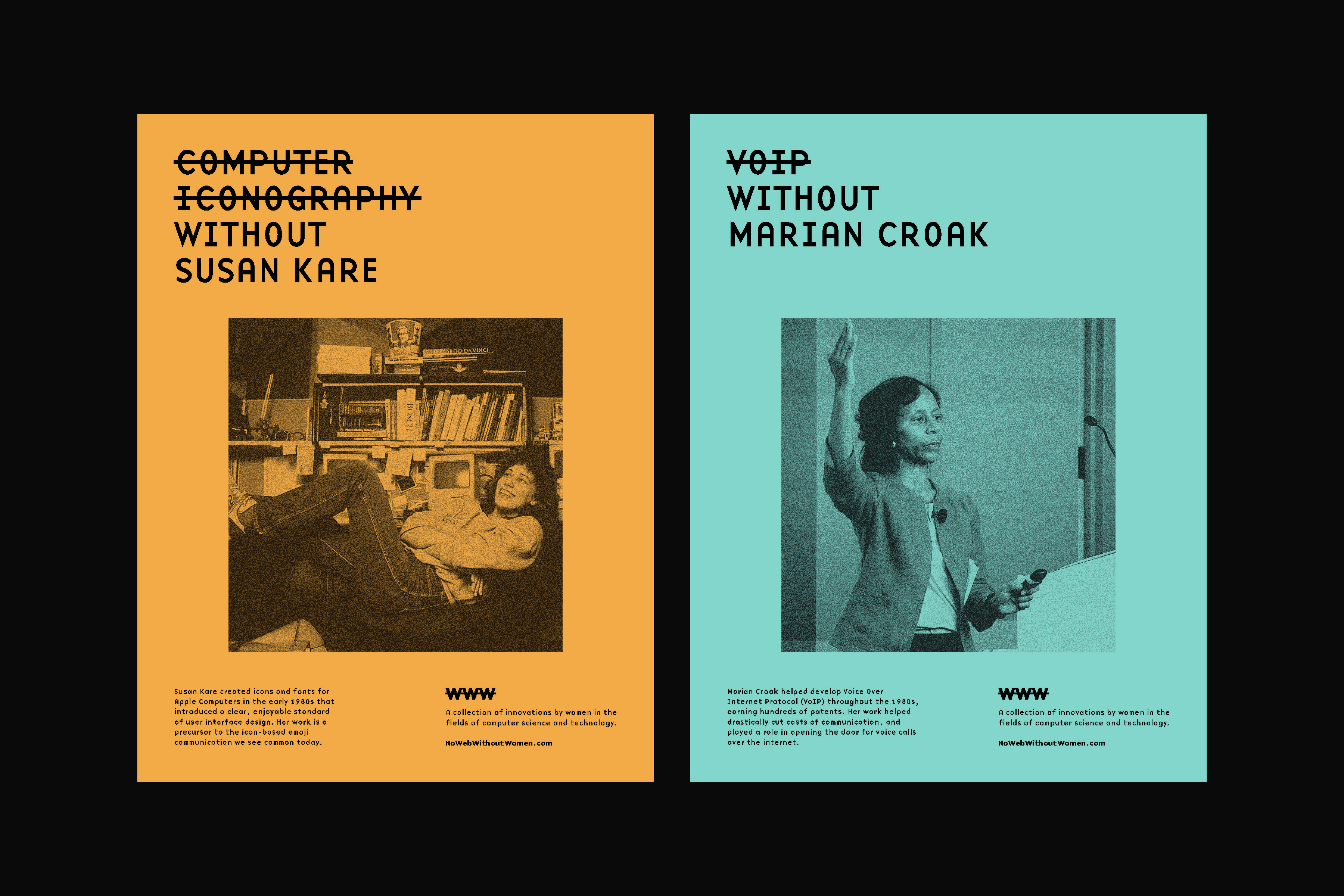 This self-initiated project was conceived in honor of Women’s History month not only to further the essential dialogue around gender equality, but also to serve as a testament to the resilience of these women, and the extent to which our contemporary lives now revolve around behavior their pioneering works make possible. A messaging epiphany emerged as we realized there is simply No Web Without Women.