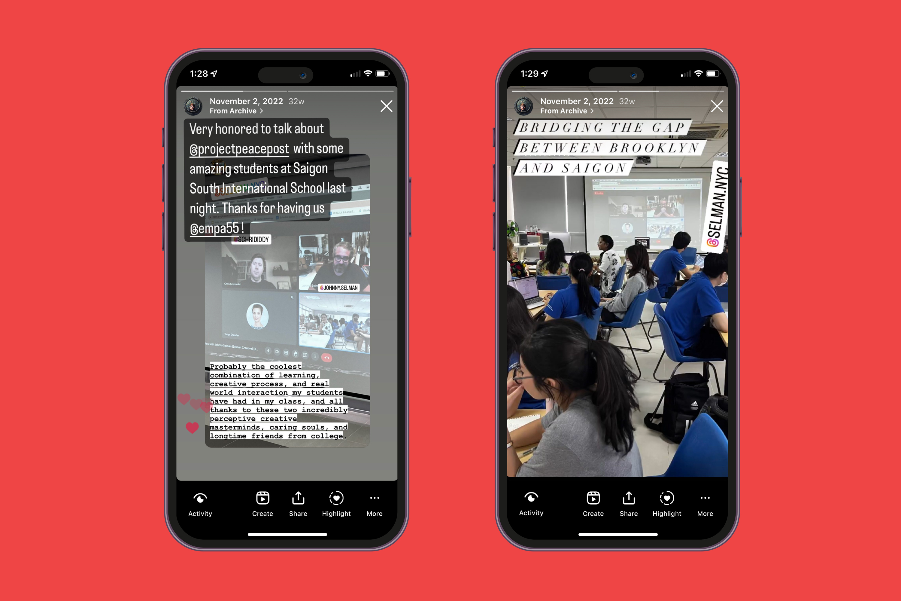 The Saigon South International School in Vietnam recently studied Peace Post in their IB Literature and Language course. Students learned how to critique and speak about art, as well as about authorial / artist choice and how it conveys meaning. Johnny and I were honored to be able to do a Q&A session with the class over Zoom. When answering questions about the struggles in particular, the project never felt more valid, and from that point, we've come away with a new enthusiasm to finish this whole thing off with a more genuine sense of love than where it started.