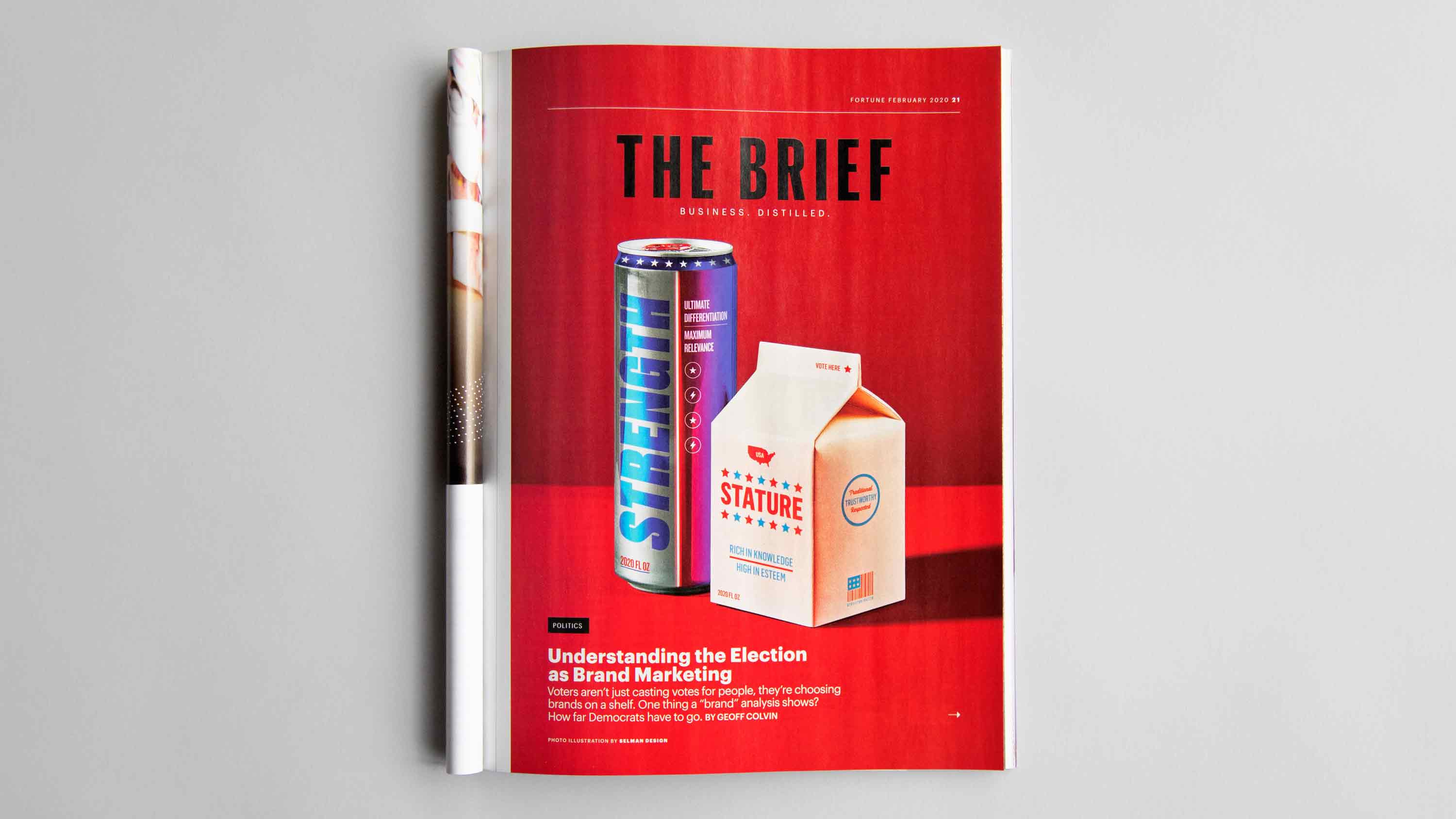 Fortune commissioned us to create an illustration for the new front-of-book section, The Brief, as part of their first redesigned issue launch in early 2020. The initial article surveyed the general election through the lens of brand marketing. Our solution? We manifested the attributes of strength versus stature as distinct beverage packages and shot them in still life. The physical objects gave a great tangible sense of the topic. So, we pitched it as an overall style to connect the subsequent bi-monthly section openers.