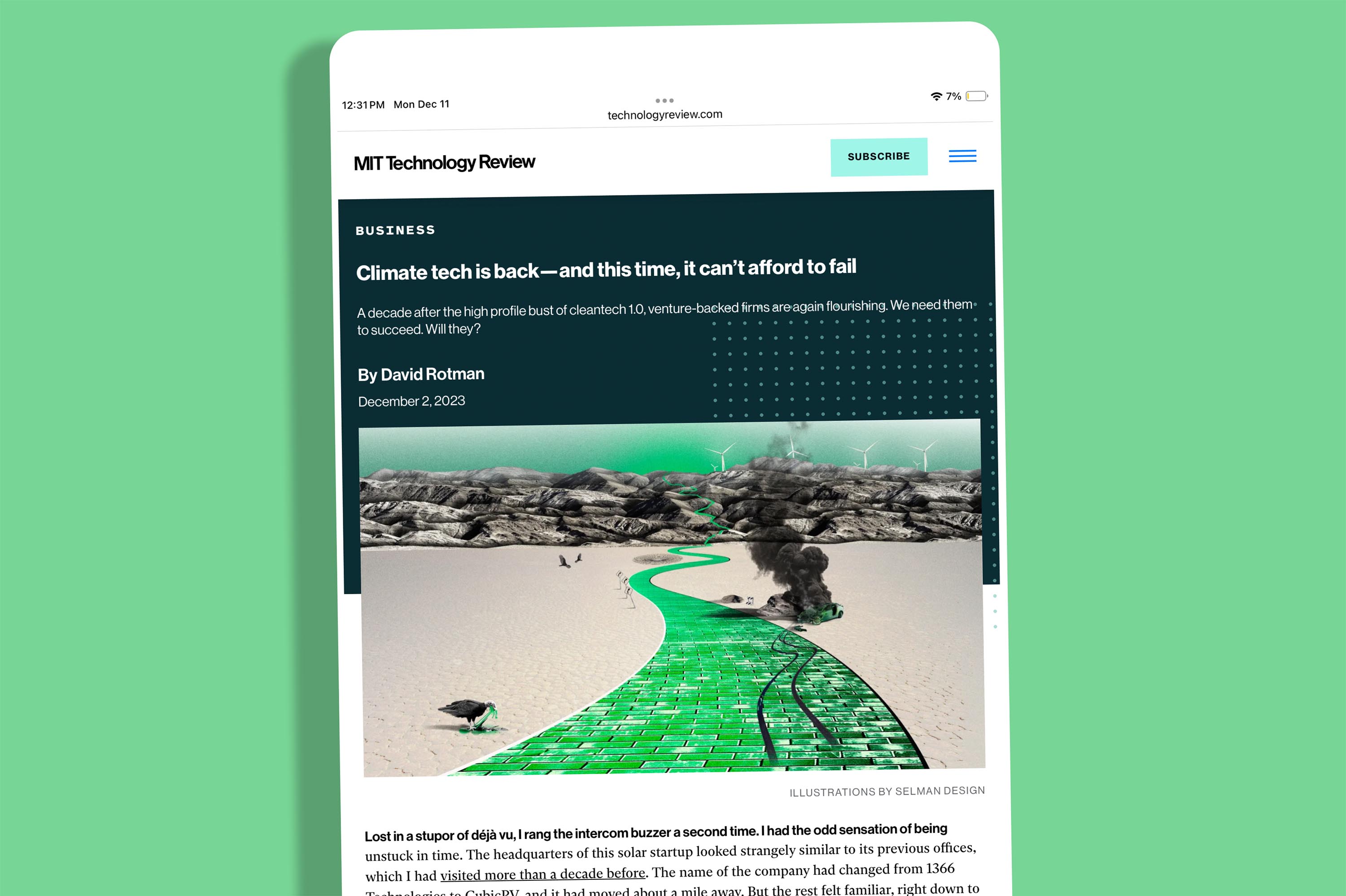 To coincide with the relaunch of The Review’s app this Fall 2023, we worked with them on their feature story about the new incarnation of clean tech innovation, revisiting past failures, learnings, and the outlook for a new era of possibility.