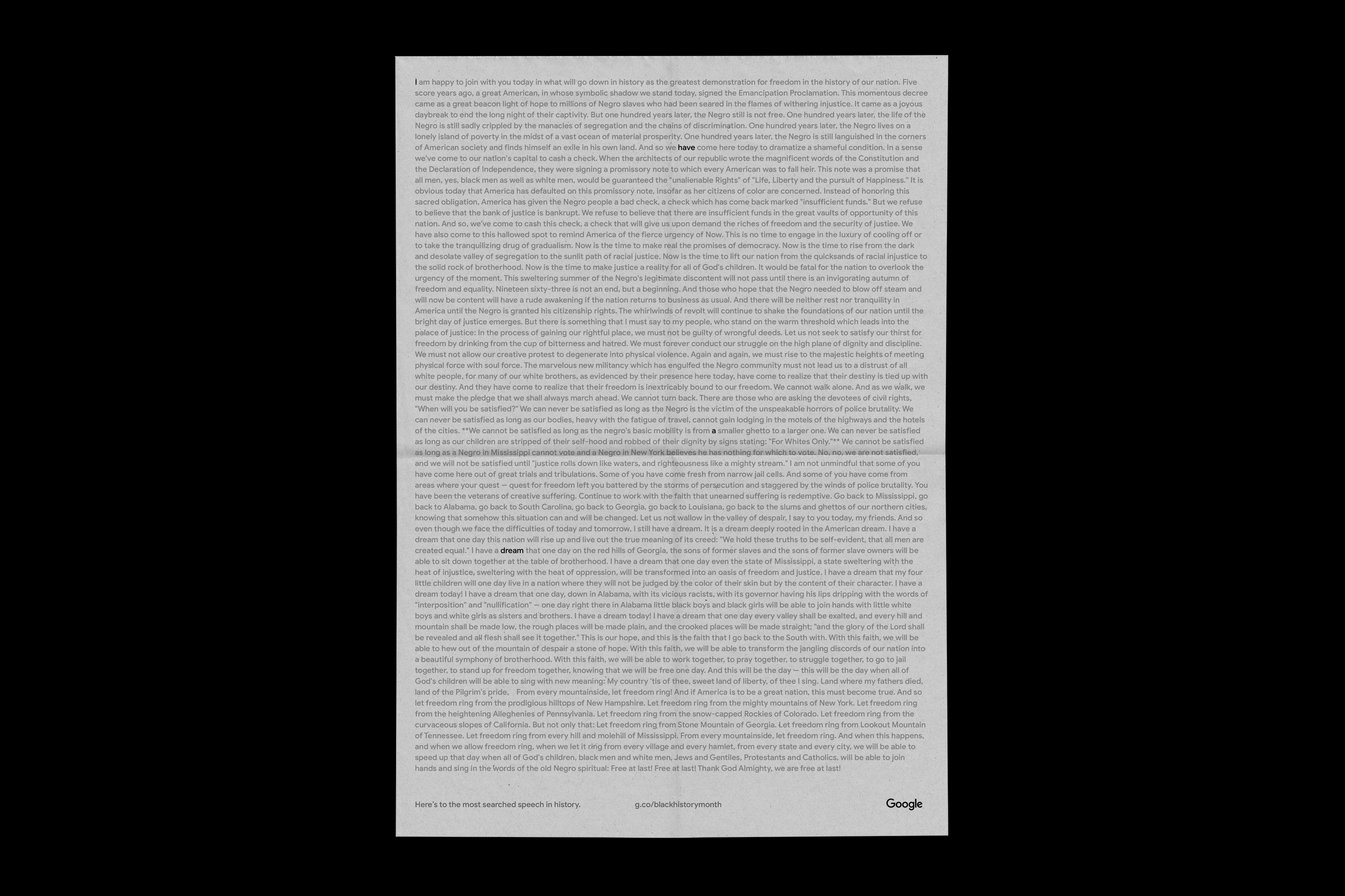 In 2020, Google celebrated Black History Month by creating a multimedia campaign featuring some of the Black Americans and Black American-led movements that were the “most searched” in the United States, according to Google Trends history, dating back to 2004. The “Most Searched” campaign tells a powerful story about how the Black community has helped shape and influence American culture. The campaign ran via social media blasts, print placements, billboards, hand-painted murals, and a high-profile television spot debuted during the Grammy Awards show.